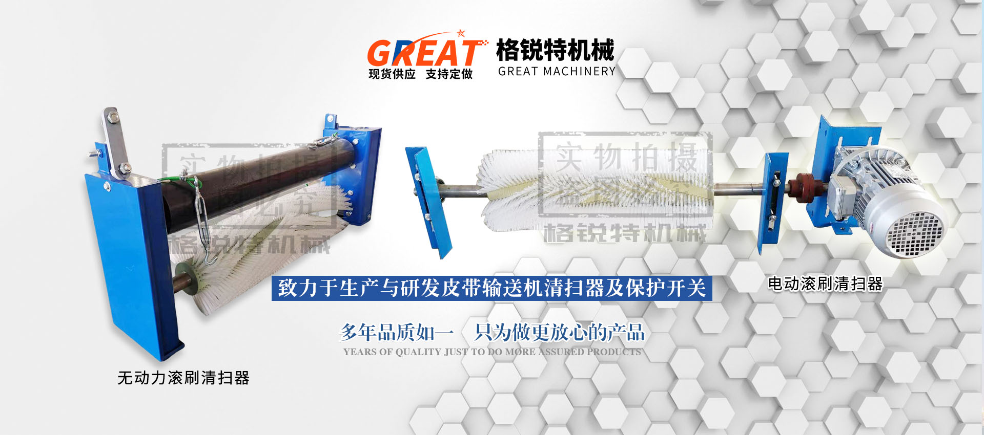 衡水格銳特機械科技有限公司常年致力于生產(chǎn)與研發(fā)皮帶輸送機清掃器及保護(hù)開關(guān),其中主營聚氨酯清掃器,合金清掃器,電動滾刷清掃器,機械式滾刷清掃器,緩沖床,緩沖條,雙向拉繩開關(guān),兩級跑偏開關(guān),打滑檢測器,料流檢測器等保護(hù)開關(guān),常年銷往各大水泥廠,煤礦廠,電廠,輸送機廠家,質(zhì)量優(yōu)越,價格實惠,望各大領(lǐng)導(dǎo)及同行來廠參觀指導(dǎo),期待您的光臨!!!